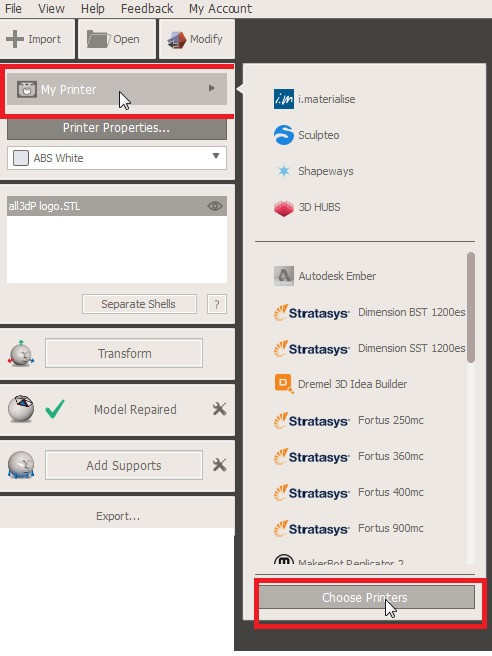 При використанні MeshMixer ви можете вибрати свій принтер зі списку або, якщо його немає в списку, вказати властивості вашого 3D принтера вручну. Ви можете відключити стіл для друку в меню you View, прибравши чекбокс з пункту Show Printer Bed. Вказати тип вашого 3D принтера ви можете в меню в правому верхньому куті. Якщо вашого 3D принтера немає в списку або ви зібрали власний, є можливість додати власні настройки.