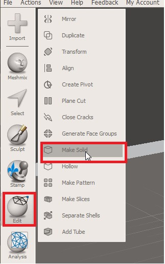 1. Натисніть Edit, а потім Hollow (відразу ж під командою Make Solid).