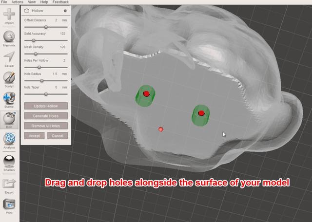 Після створення порожнечі в моделі, вона ще не готова до 3D друку! У деяких технологіях 3D друку, наприклад, metal sintering в якості матеріалу використовується metal dust. У більшості випадків, під час SLS друку вам необхідний shell of your model, так що зробити модель порожнистими - відмінна ідея. Однак powder material всередині моделі все одно залишиться і якщо його не видалити, буде коштувати вам грошей. Якщо ви плануєте sintering your model, треба створити escape holes for the dust. І MeshMixer пропонує ефективний інструмент для створення таких отворів!