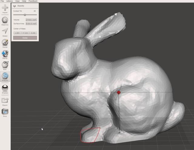 Іноді вам треба зробити швидкий аналіз геометрії вашої 3D моделі. MeshMixer не може змагатися з серйозними FEM-аналіз програмами, але відмінно впорається з розрахунком таких властивостей як обсяг і маса моделі. Розрахувати ці параметри ви можете за допомогою інструменту Stability.