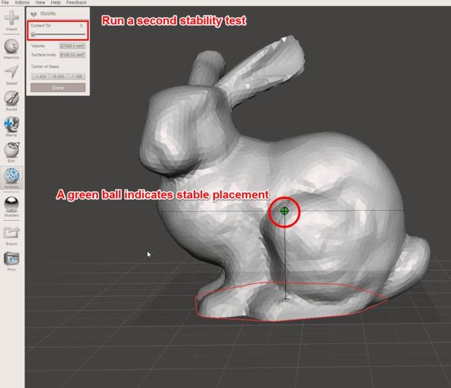 Перед початком 3D друку, треба переконатися, що об'єкт перебуває на одній площині з підставою. Для цього перейдіть в меню Analysis> Stability. Цей інструмент Meshmixer розрахує площу поверхні і об'єм вашого об'єкта. Більш того, червоним кольором буде відзначена поверхню контакту моделі з заснованої площиною і if your object can tip. Налаштовуючи Contact Tol ви додаєте або забираєте some clearance між основною площиною і об'єктом. Червона точка в центрі вашого об'єкта вказує на нестабільну позицію. Green-lit - стабільна.